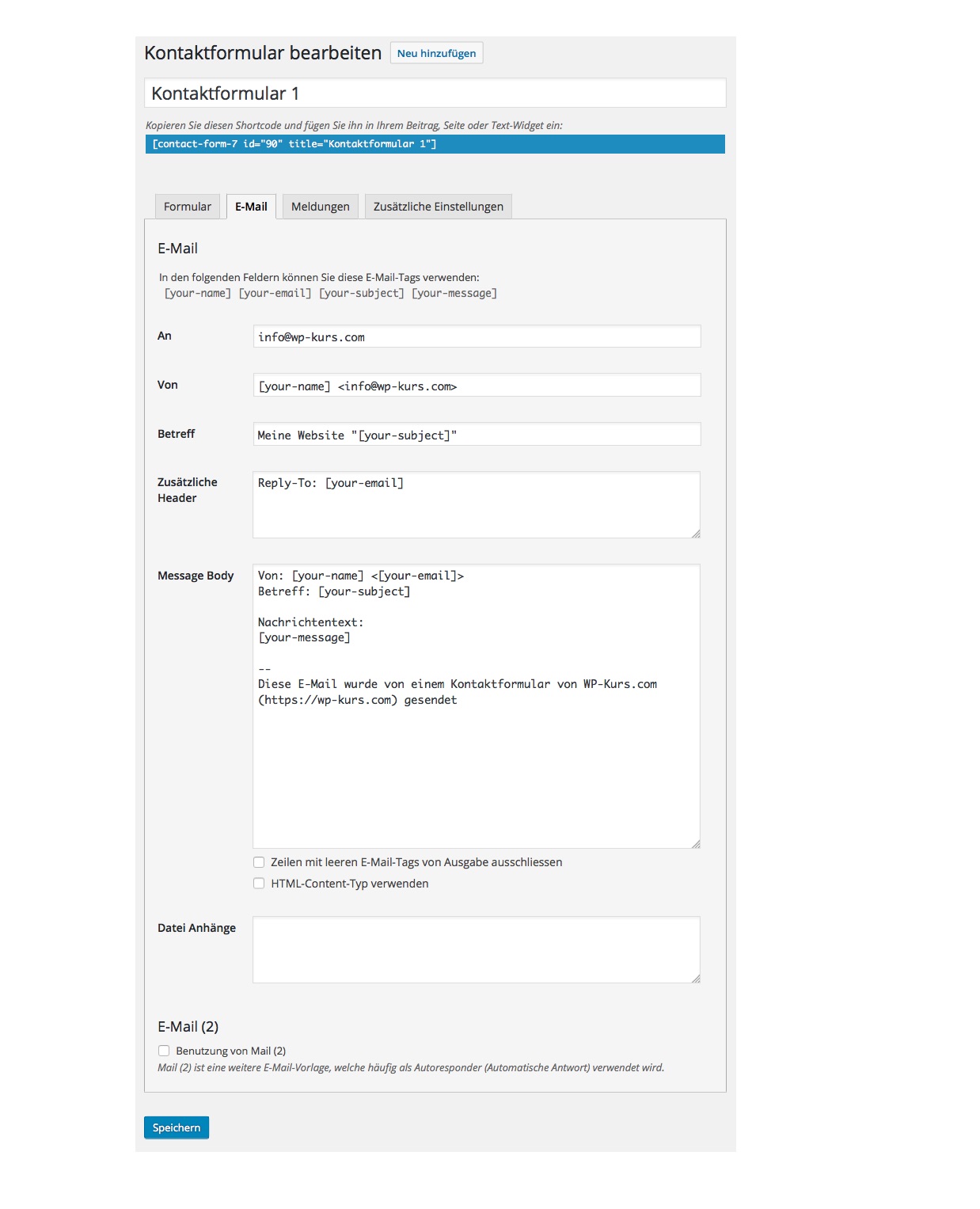 - E-Mail (2) Contact Form 7 erlaubt es Ihnen, zwei E-Mails zu verschicken. Sie haben dann die gleichen Optionen wie in E-Mail 1. Dies ist dann praktisch, wenn Sie dem Benutzer ebenfalls eine E-Mail zuschicken möchten.