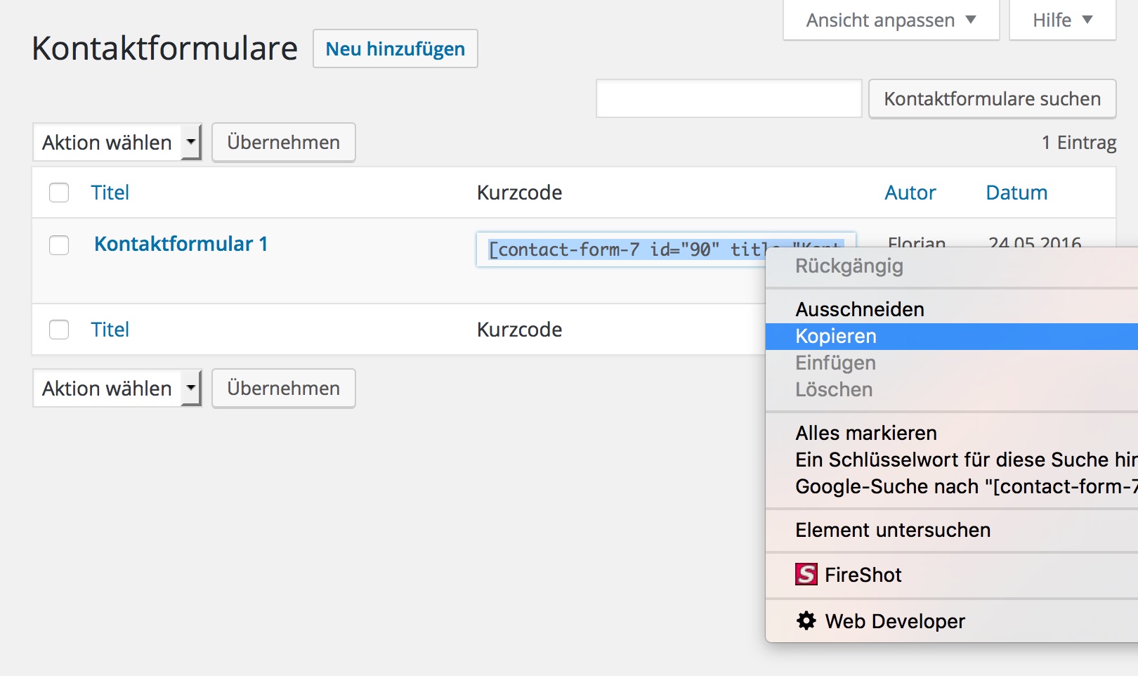 Sie sehen dann eine Übersicht über Ihre bereits erstellten Formulare. In der Spalte „Kurzcode“ finden Sie den so genannten Shortcode, den Sie kopieren müssen. Wählen Sie dazu den Text aus und klicken Sie mit der rechten Maustaste. Wählen Sie dann „Kopieren“.