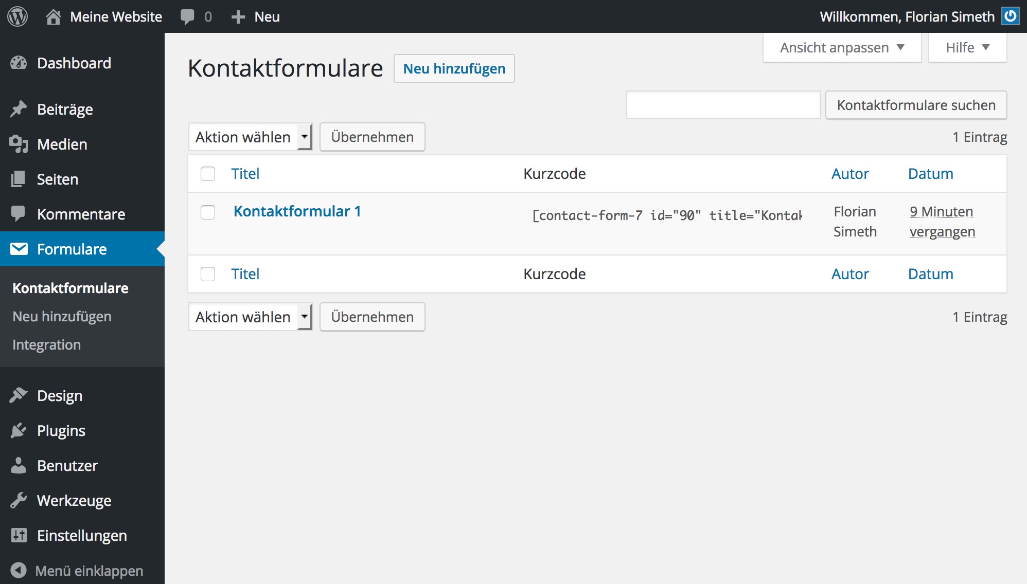 Wie Sie sehen werden, gibt es bereits ein Standard-Formular, welches viele von Ihnen so vielleicht schon übernehmen werden. Mit einem Klick auf das Formular mit dem einfachen Namen „Kontaktformular 1“ können Sie es bearbeiten.