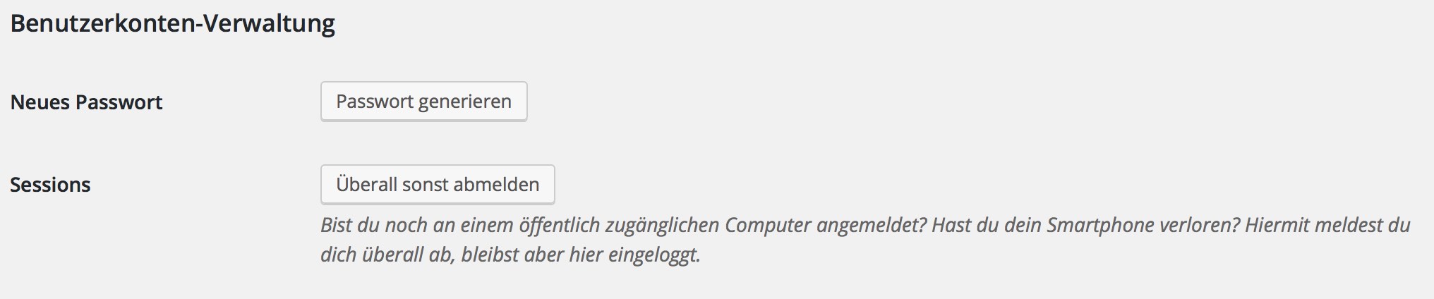 Eine Session ist auf deutsch eine „Sitzung“. Jedes Mal, wenn Sie sich in WordPress anmelden, erzeugen Sie eine neue Sitzung. Diese Sitzungen bleiben so lange bestehen, bis Sie sich wieder abmelden oder die Gültigkeit der Session abläuft. Mit dem Button „Überall sonst abmelden“ haben Sie die Möglichkeit, alte Sitzungen zu schließen bzw. zu entfernen.