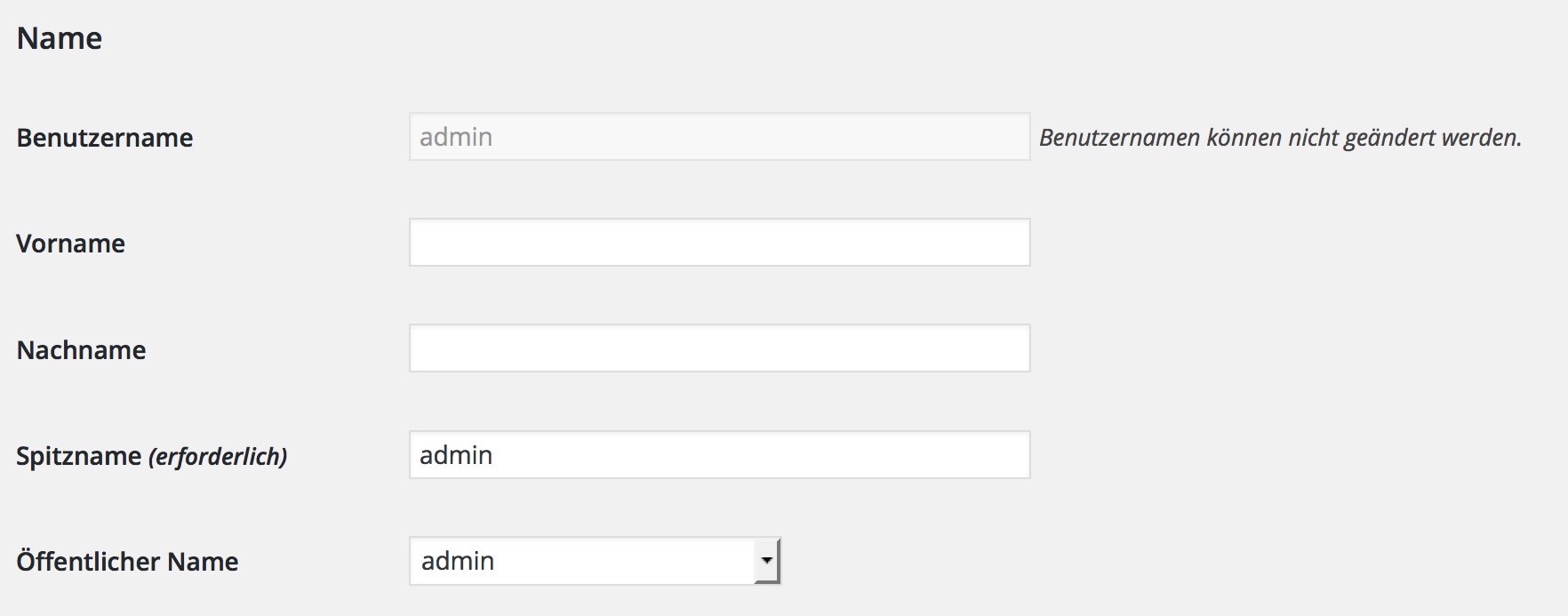 Aus den Namen, die Sie oben eingegeben haben (Vorname, Nachname, Spitzname) baut WordPress einige Konstellationen zusammen. Eine davon können Sie hier wählen. WordPress selbst, aber auch viele Plugins und Themes nutzen dann den öffentlichen Namen anstatt des Benutzernamens.