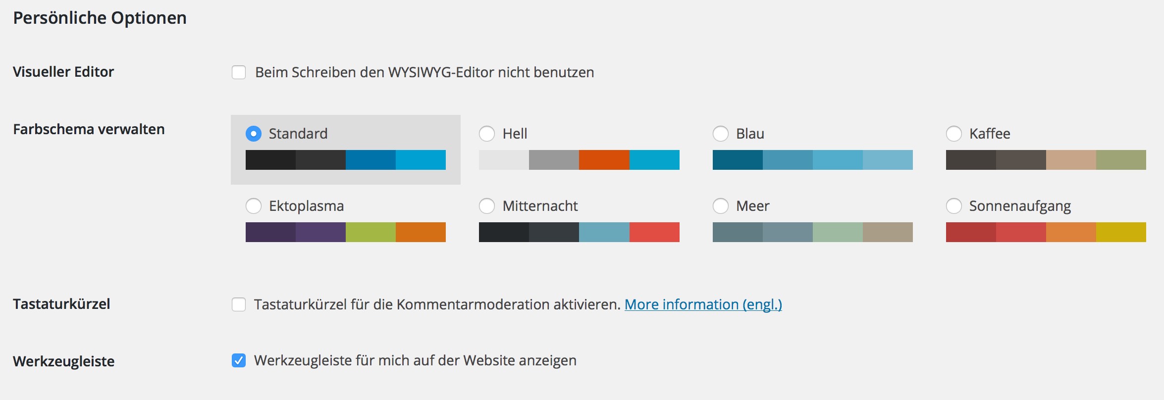 Wenn Ihnen das aktuelle Layout des WordPress Dashboards nicht gefällt, können Sie hier andere Farben wählen. -