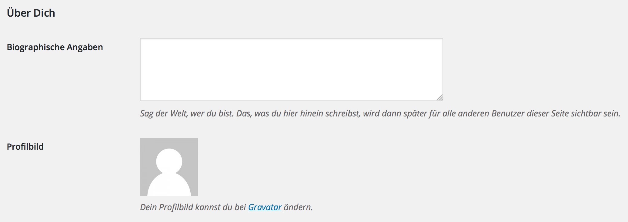 Auch ein Bild von sich selbst können Sie einstellen. Das direkte hochladen wird derzeit allerdings nicht unterstützt. Stattdessen nutzt WordPress den Dienst „Gravatar“. Das Bild wird ebenfalls an diversen Plätzen im Frontend eingebunden.