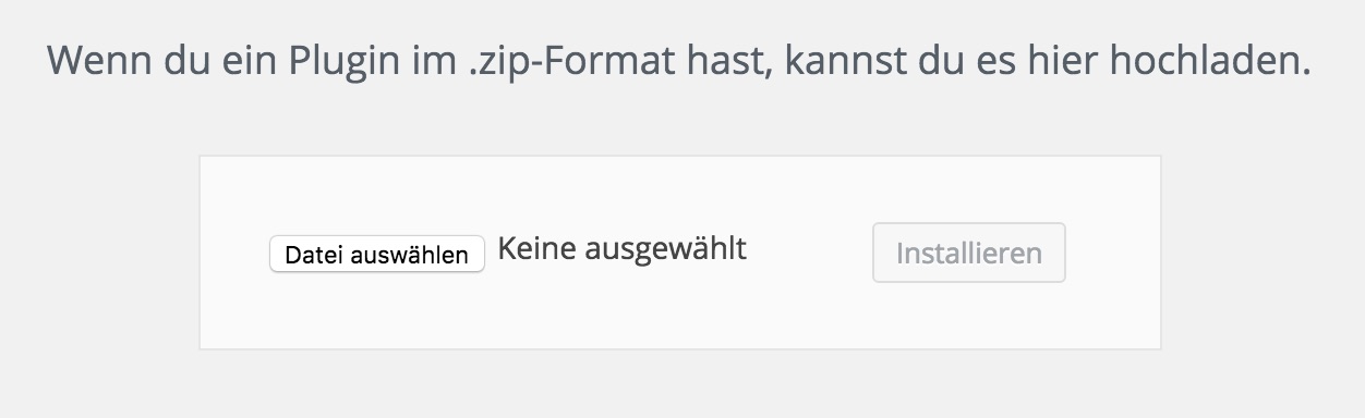 WordPress erwartet, dass Sie eine ZIP-Datei (also keinen Ordner oder ein sonstiges Format) hochladen. In der Regel bekommen Sie vom Anbieter des Plugins eine fertige ZIP-Datei geliefert, die Sie an dieser Stelle benutzen können.
