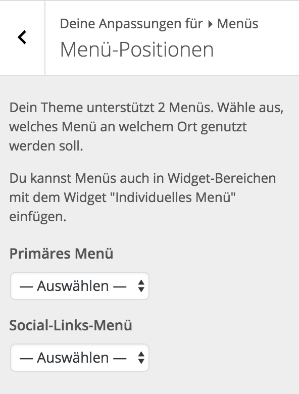 Da unser aktuelles Theme (TwentySixteen) zwei Menü-Positionen unterstützt, werden diese hier aufgelistet. Die primäre und die Social-Links-Position. Über das Auswahlmenü können Sie dann zuweisen, welches Menü zu welcher Position hinzugefügt werden soll.