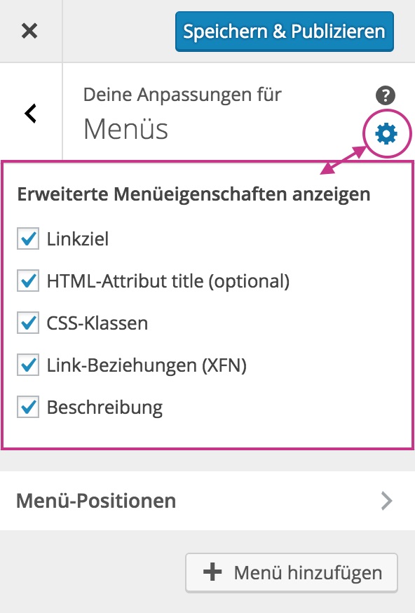 In dieser Ansicht wird Ihnen normalerweise eine Liste aller Menüs angezeigt. In unserem Fall existiert allerdings noch keines. Deswegen erscheint lediglich der Punkt „Menü-Positionen“. Beachten Sie in diesem Zuge auch das Einstellrad oben rechts. Klicken Sie darauf um sich erweiterte Optionen anzeigen zu lassen.