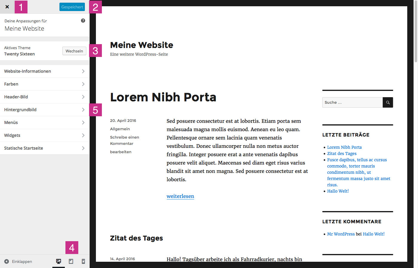 Wie oben beschrieben ist dieser Bereich davon abhängig, welches Theme Sie installiert haben. Wir möchten einige Einstellungen anhand des Standard-Themes „TwentySixteen“ erklären.