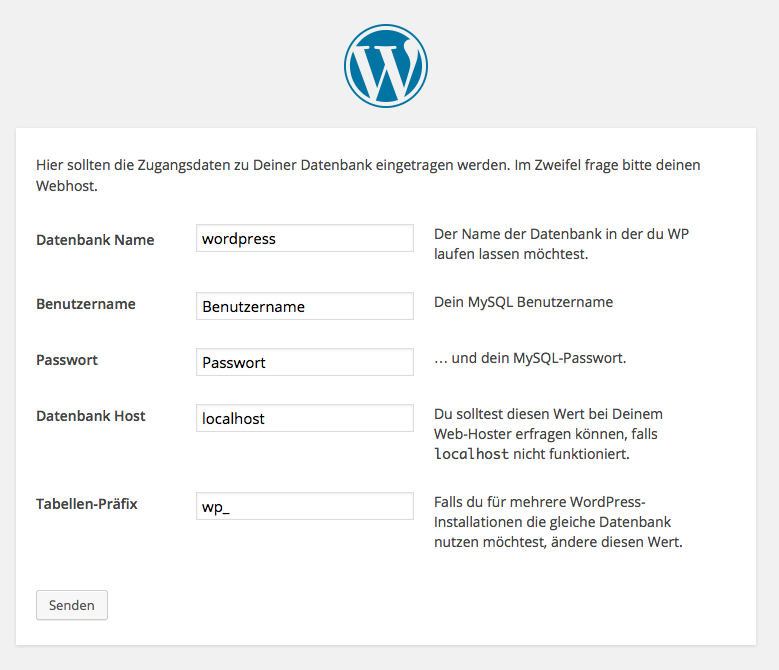 Im nächsten Fenster beschreibt WordPress, dass es die Datenbank installieren will und welche Daten es dafür benötigt: