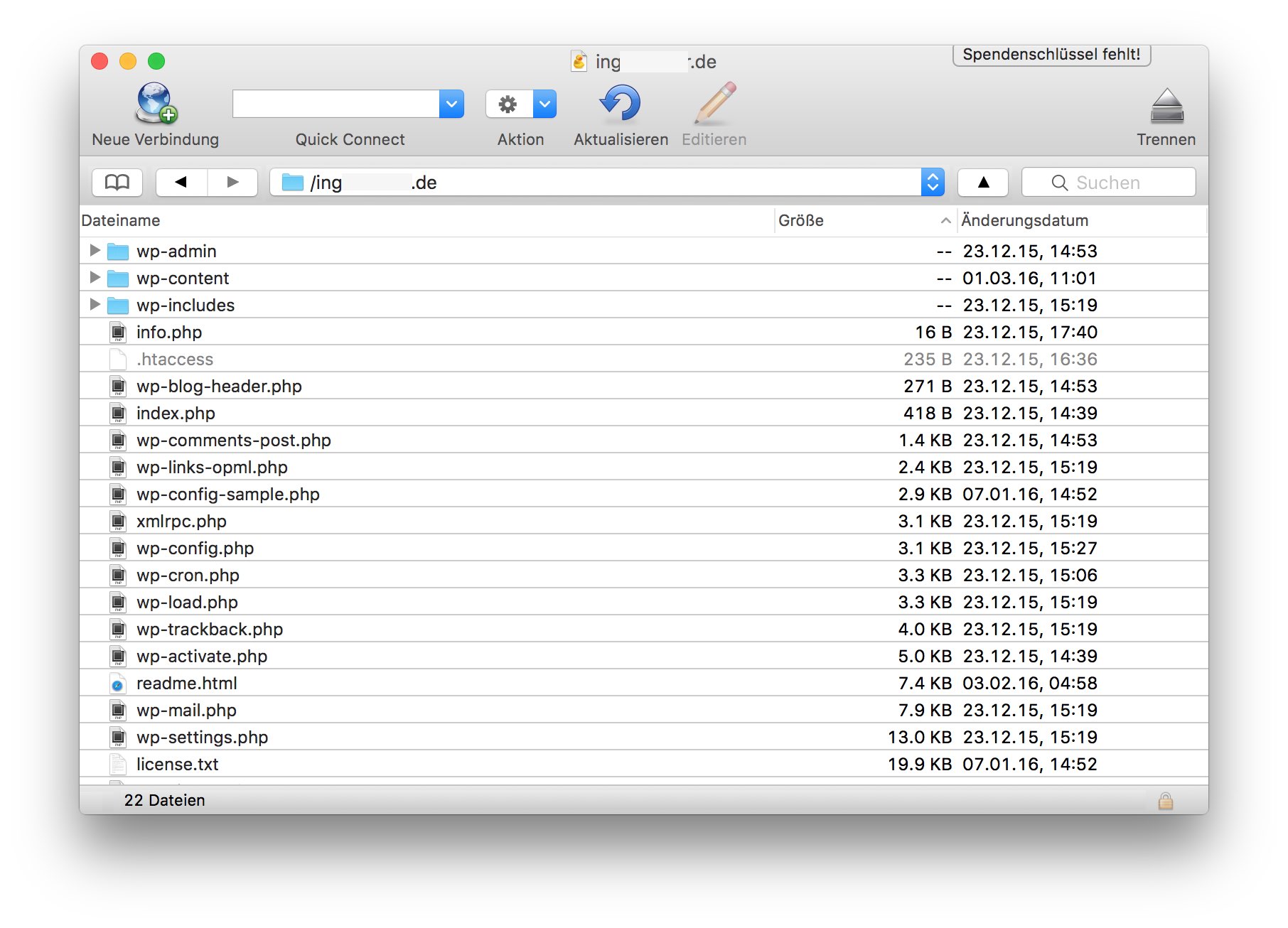 Ein FTP-Client (für Mac z.B. CyberDuck, für Windows z.B. FileZilla) bildet die Schnittstelle zwischen einem Computer und einem Server und gibt Ihnen die Möglichkeit, Dateien zwischen Ihrem Computer und dem Server des Hosting-Providers auszutauschen. Ein solches FTP-Programm benötigen Sie, um WordPress auf Ihrem Webspeicherplatz zu installieren. Die FTP-Zugangsdaten erhalten Sie, wenn Sie sich online mit Ihrem Account beim Provider einloggen.
