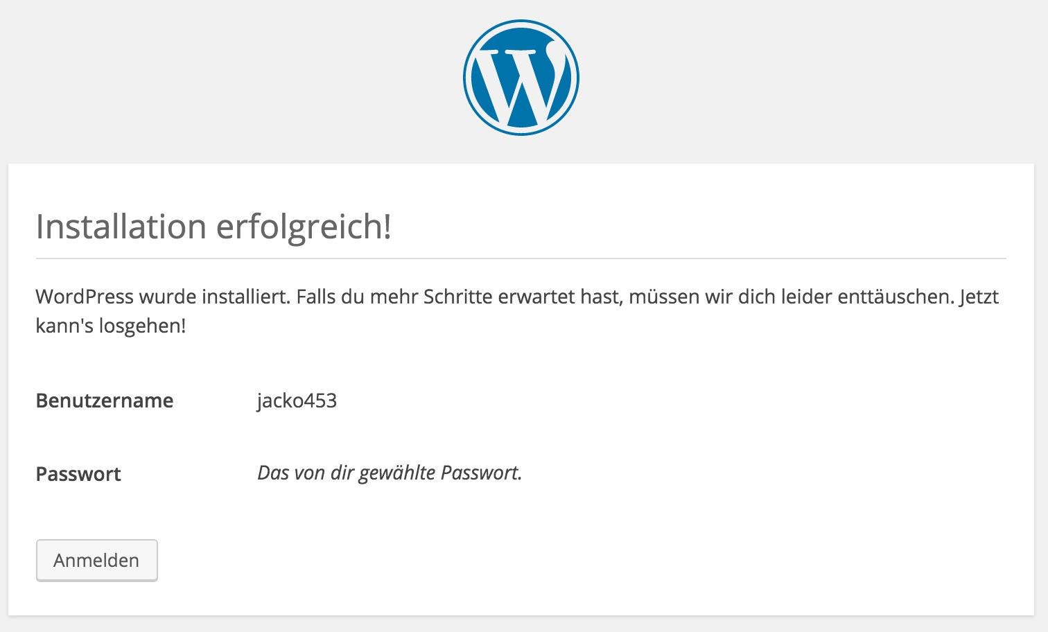 Schließen Sie die Installation mit einem Klick auf „WordPress installieren“ ab. Sie sehen danach die Erfolgsmeldung und erhalten eine E-Mail ähnlich der folgenden: