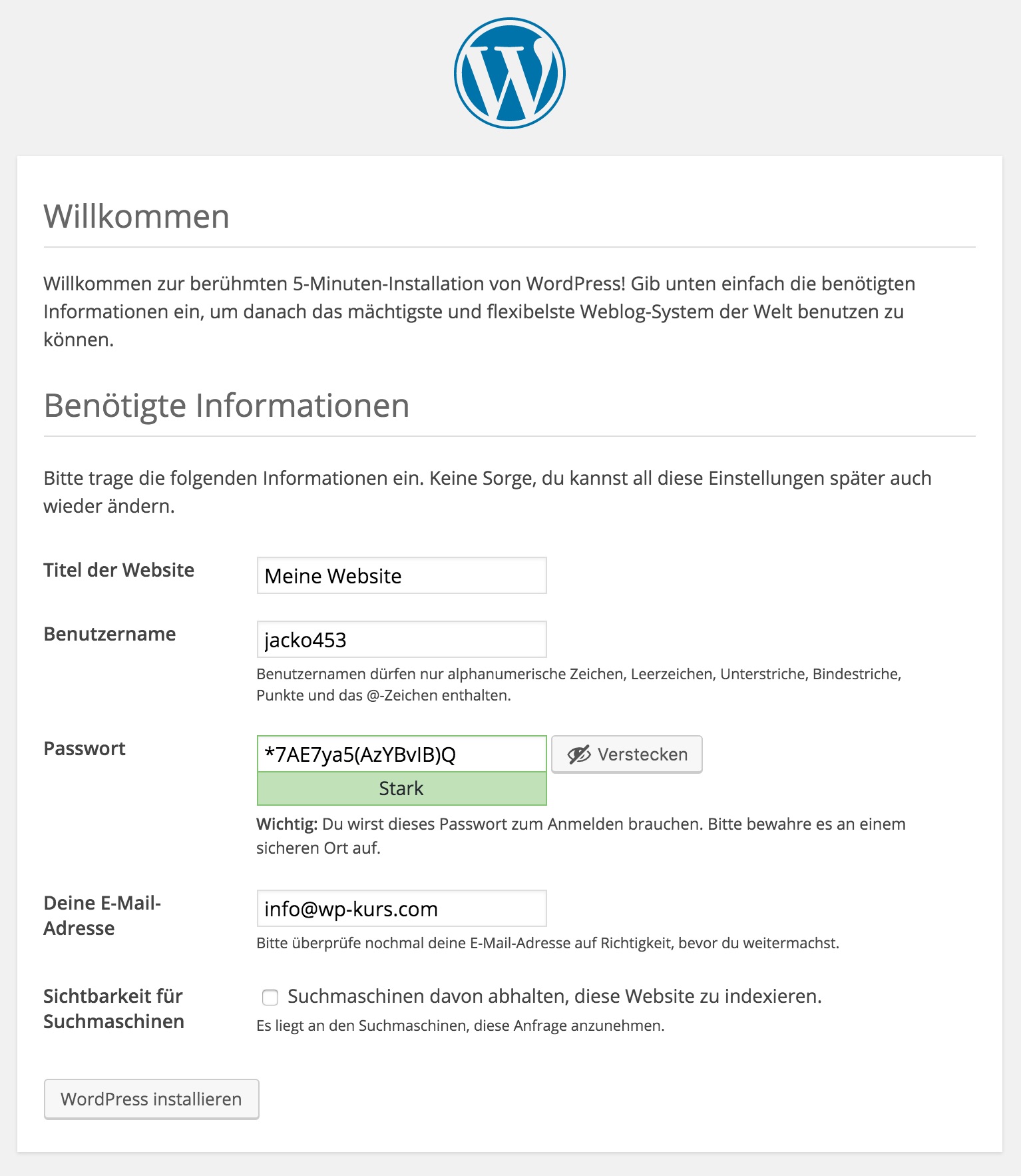 Tipp: Bitte wählen Sie ein sicheres Passwort. Nur dann ist sichergestellt, dass wirklich niemand auf Ihre WordPress-Installation zugreifen oder das Passwort gar erraten kann. Natürlich haben Sie jederzeit die Möglichkeit, das Passwort nachträglich zu verändern.