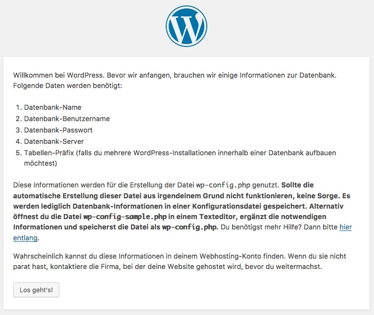 Die im nächsten Fenster eingegebenen Daten werden in die Datei wp-config.php geschrieben. WordPress beschreibt, wie Sie vorgehen sollen, wenn die Datei nicht für Sie generiert werden kann. Wir zeigen Ihnen in einem zukünftigen Video, wie das im Detail funktioniert. Jetzt genügt es, wenn Sie auf „Los geht’s“ klicken.